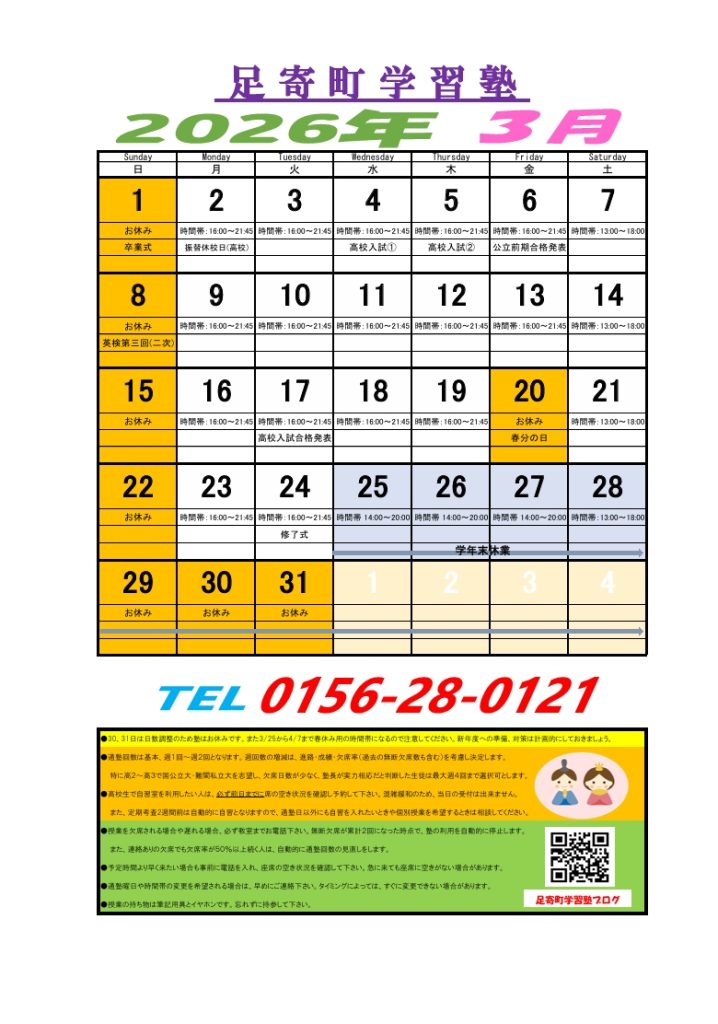 3/30、31の二日間は塾の日数調整のためお休みです。